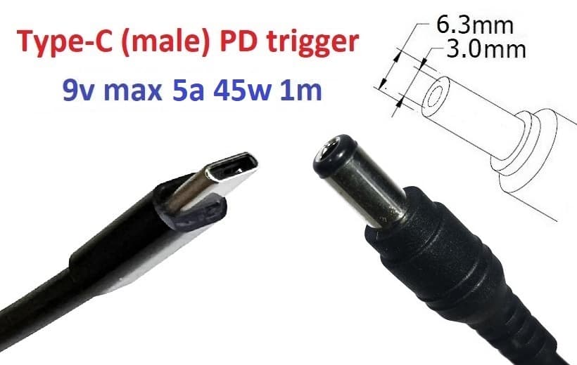 Adapter to 9v (max 5a, 45w) 6.3x3.0mm 1m from USB Type-C (male) Power Delivery PD trigger (A class) 1 day war.